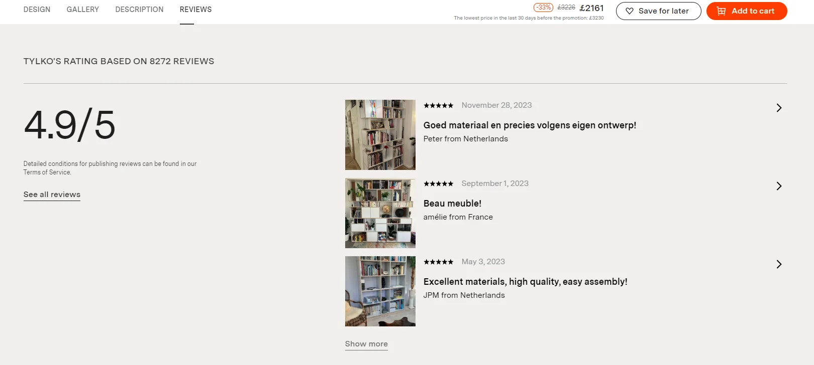 Platforms like Westwing include textual reviews, while tylko.com goes a step further. It allows customers to upload real-life photos of the product in use.