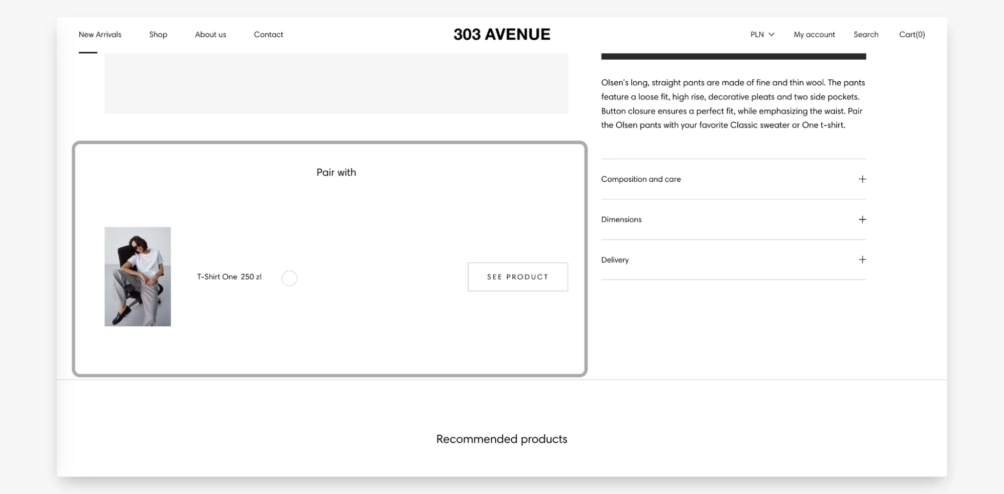 - The “Pair with” section under the product description lets the customers easily fill in the total look of models.