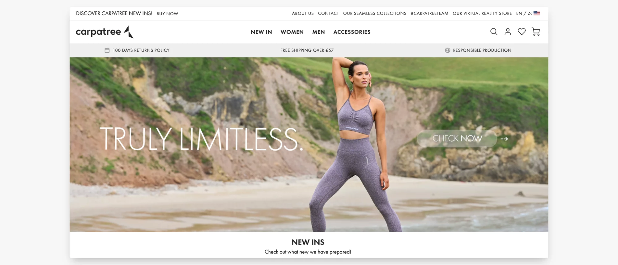 Carpatree pays attention to details and makes sure all its customers get the right fit for their workout clothes. It’s a great Shopify fashion store that product pages contain detailed descriptions, from the size of each item to its fabric composition and care instructions.