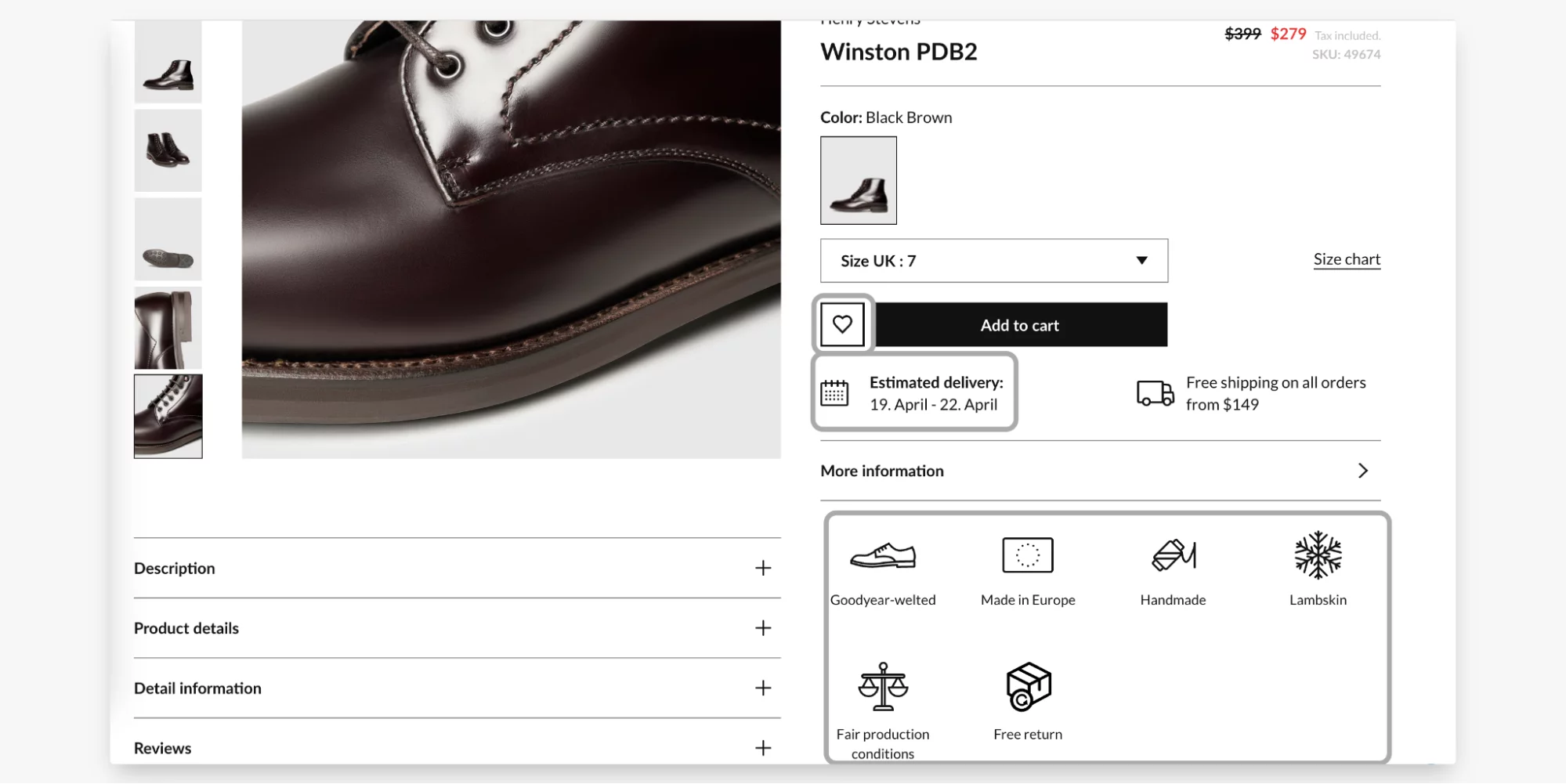 - Heart icon to “Save your favorite items” feature that allows customers to save products they want later and have them on their wishlist.