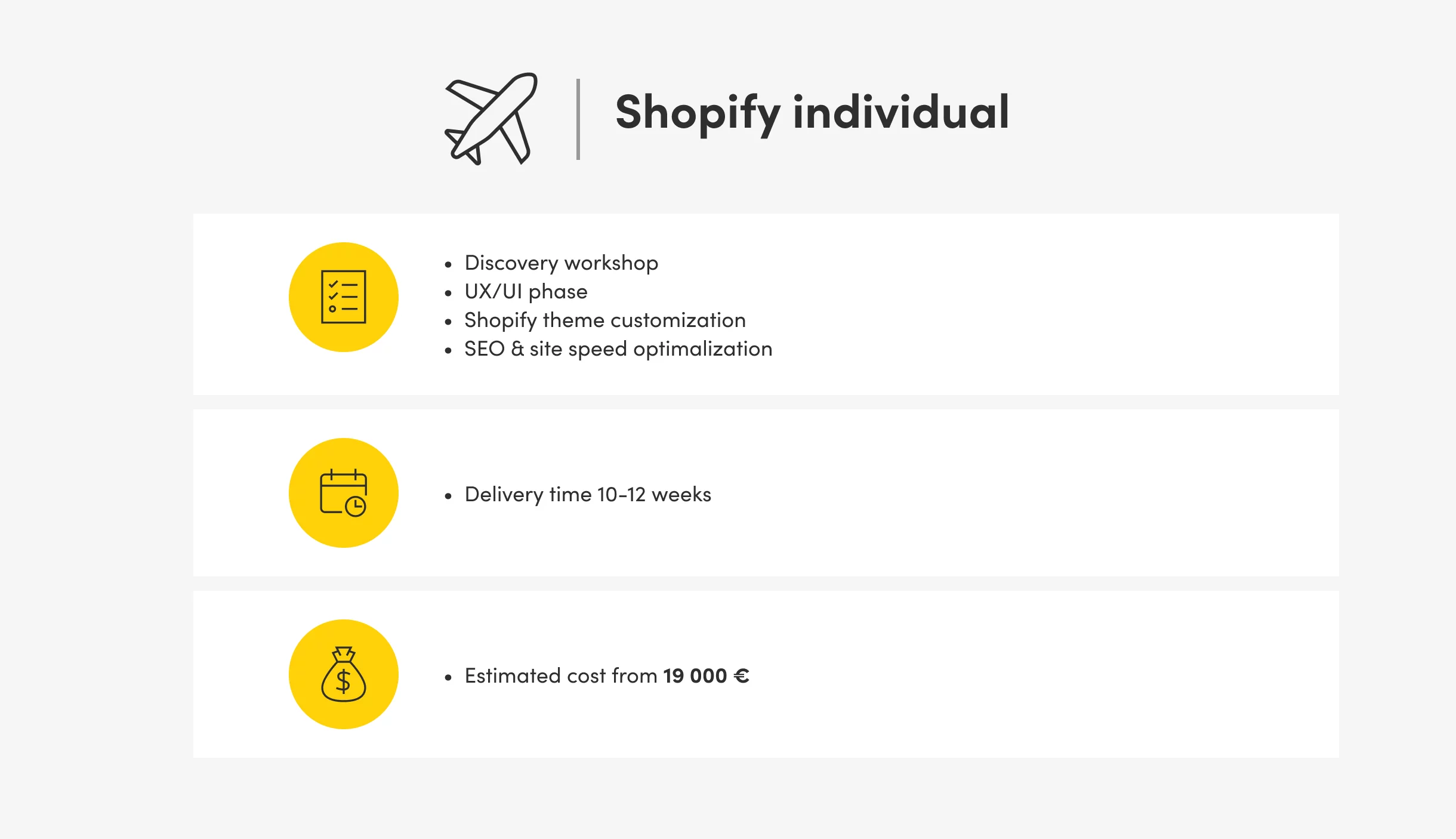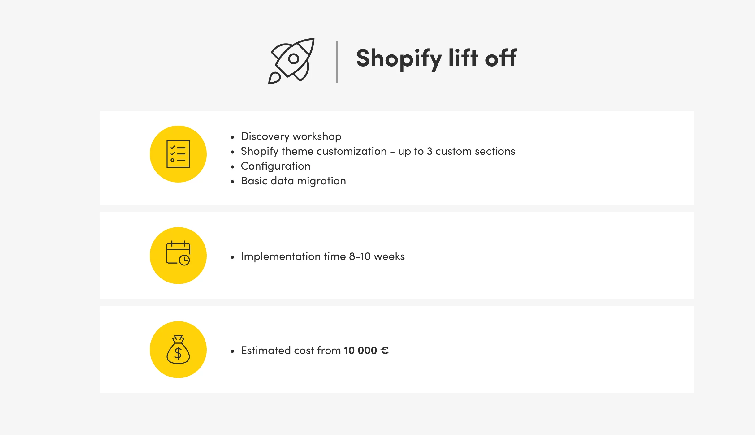 The first is to conduct a Discovery workshop, which will allow the team to better understand your products and business, and plan the best solutions. After that comes the project implementation, which takes about 8-10 weeks. In this option, we also assume up to 3 custom sections in the store, which will be made by developers according to predetermined guidelines. The cost of such a project starts at €10 000.