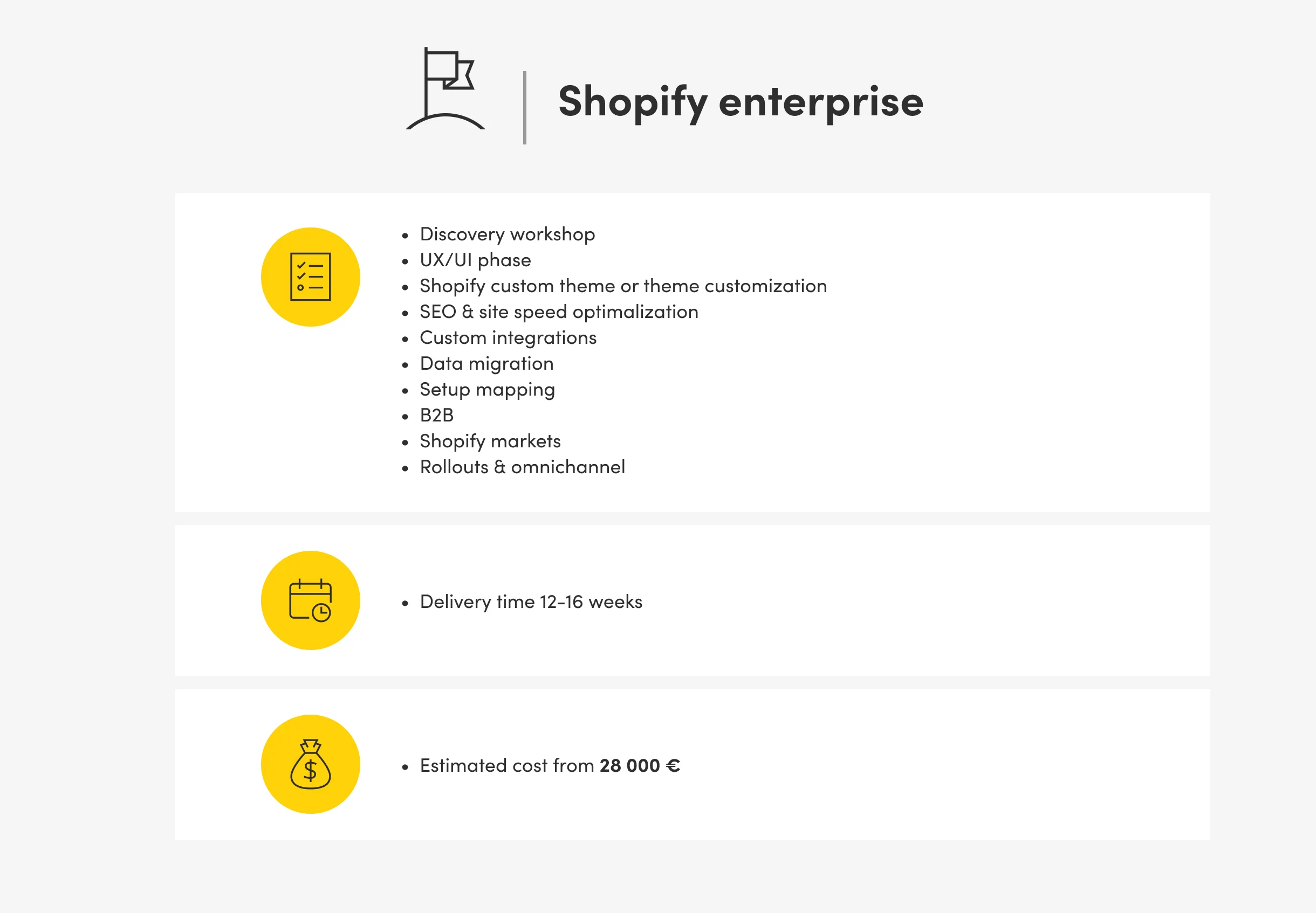 If the above versions are not enough for you, this is a solution for definitely more demanding businesses. In this option, we take into account the solutions from the previous point, so full customization of the platform, support in shopify optimization for SEO and performance, plus migration of data from the current platform to Shopify, implementation of Shopify Markets (worldwide sales), and adding a platform for B2B sales. Such a comprehensive solution takes the team between 12 and 16 weeks of implementation. The cost of such a project starts at €28,000.