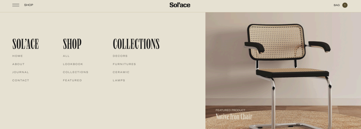 A good home décor store guides visitors gently, the way Sol’ace does. Its menu feels calm and open, with clear categories like Shop and Collections. Nothing competes for attention. Each word has space, and the structure helps people move from inspiration to products without effort. That’s the goal: navigation that feels invisible because it just works.