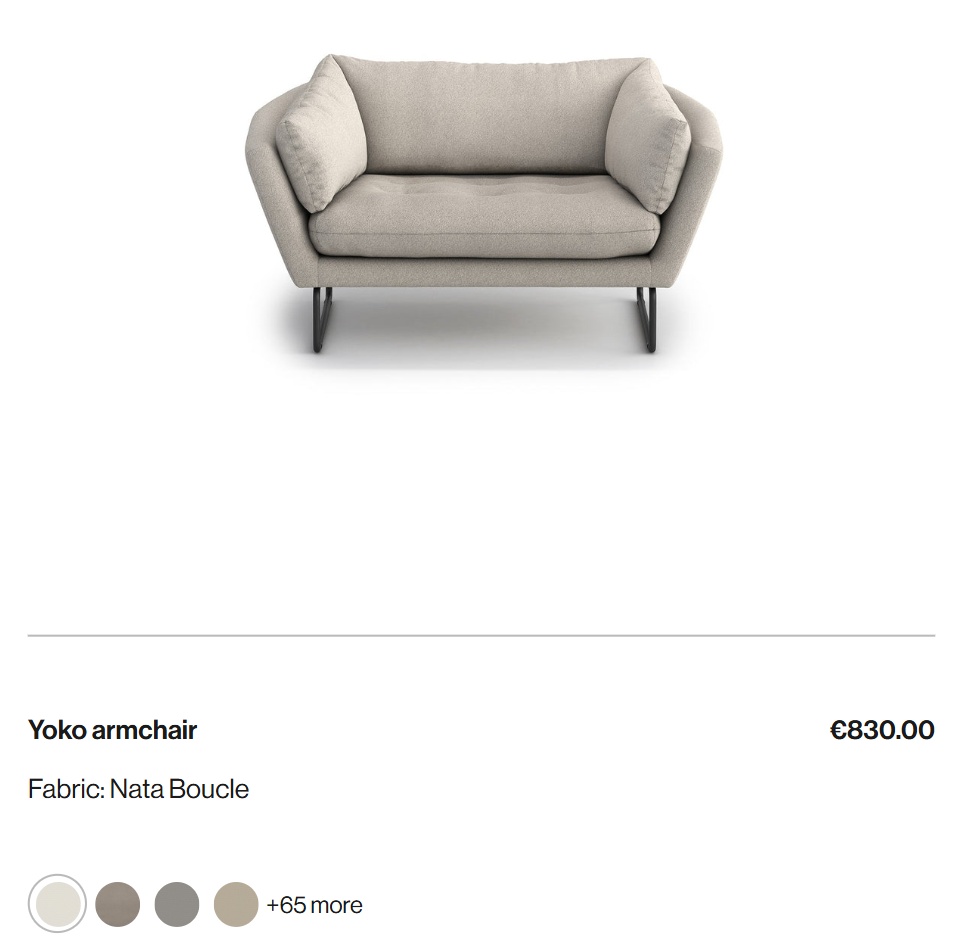 Optisofa’s Mia armchair page lets shoppers switch between dozens of fabric colours, instantly updating the image. The chair turns into a personal project where each click builds trust and ownership. The zoom feature and neat layout give space for details like stitching and surface texture. Every photo stays clean and quick to load.