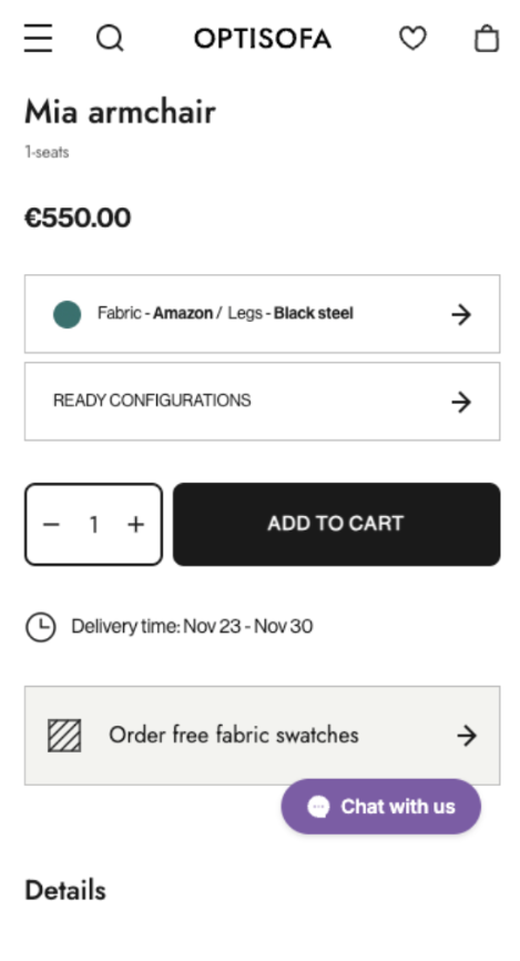 Optisofa shows how clarity builds confidence. The Mia armchair page keeps the name, price, and options in plain sight. Customers can pick fabric and leg colour right away, and the price updates instantly. There’s no guessing. The delivery time appears just below, reminding shoppers when to expect the product. The black button is large and direct. It also leaves no doubt about what to do next.