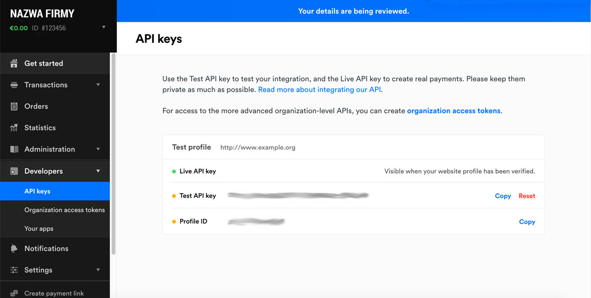 Po założeniu konta Mollie, konieczne będzie wykonanie przelewu na kilka eurocentów, aby zweryfikować merchanta. W niektórych wypadkach Mollie prosi o tłumaczenie dokumentów potwierdzających dane firmowe na j. angielski.