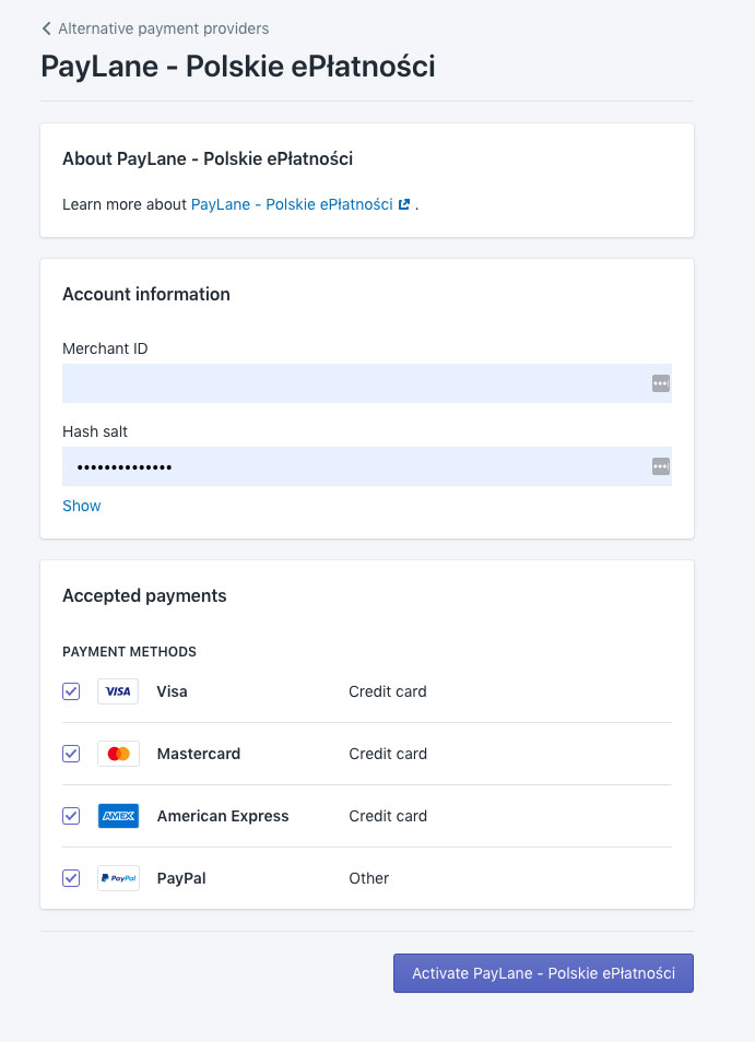 Integracja z Paylane jest zdecydowanie najprostsza do wdrożenia i dostępna bezpośrednio z poziomu panelu Shopify. Wszystko co trzeba zrobić to wprowadzić dwa parametry (można je odszukać w panelu merchanta w Paylane).