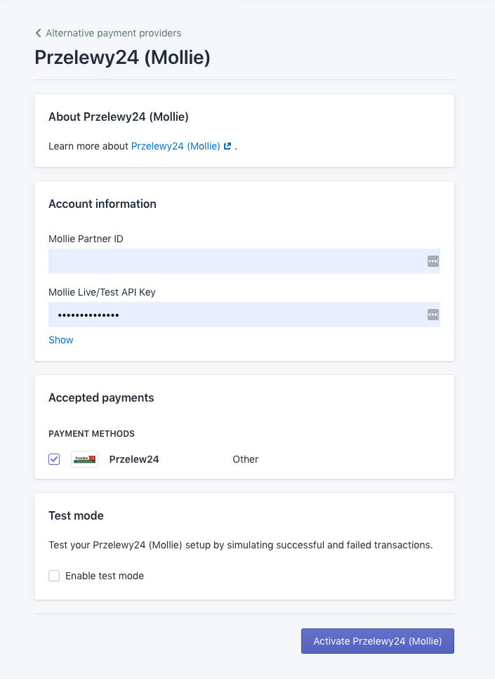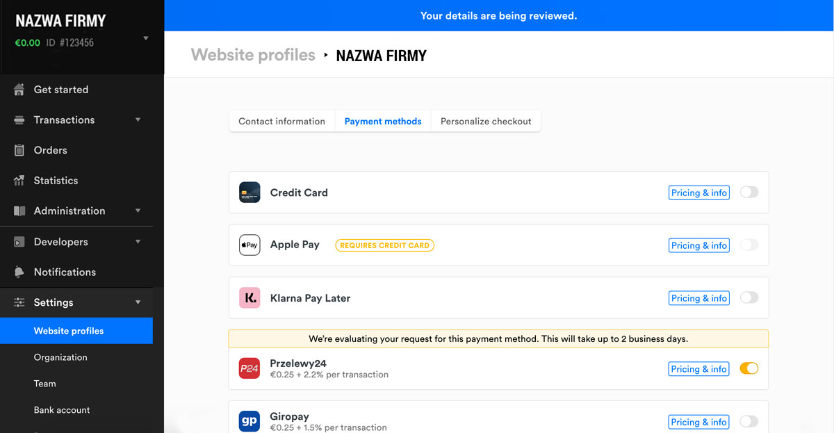 Po pierwsze konieczne jest posiadanie konta w systemie Przelewy24. Druga platforma to Mollie - wiodący europejski agregator bramek płatności oferujący możliwość płacenia w całej Europie za pomocą najbardziej popularnych bramek - m.in. Klarna, Giropay, Sofort, a teraz również Przelewy24.