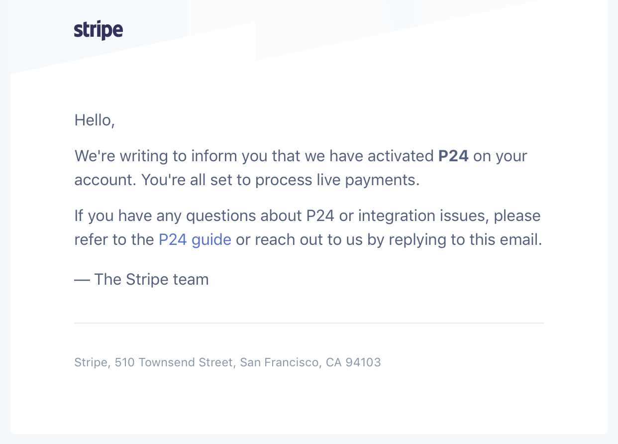 W porównaniu do Mollie mamy tutaj bardzo duże ułatwienie, ponieważ nie musimy zakładać wcześniej konta w P24, Stripe załatwia to niejako za nas.
