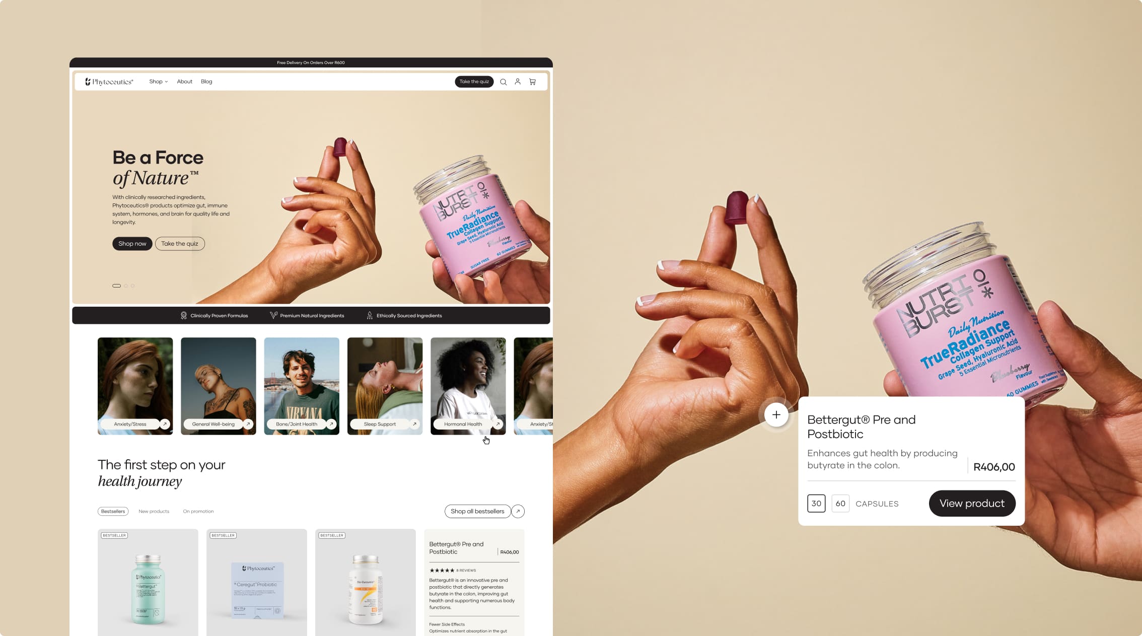 From a brand perspective, the new store had to stay true to the brand’s DNA – it needed to be visually appealing, modern, and reflect the scientific nature of Phytoceutics’ products. Additionally, the UX/UI design had to clearly communicate the scientific advancement behind each formula and its health benefits – from gut health to longevity – all while staying aligned with the brand’s philosophy: “Be a Force of Nature.”